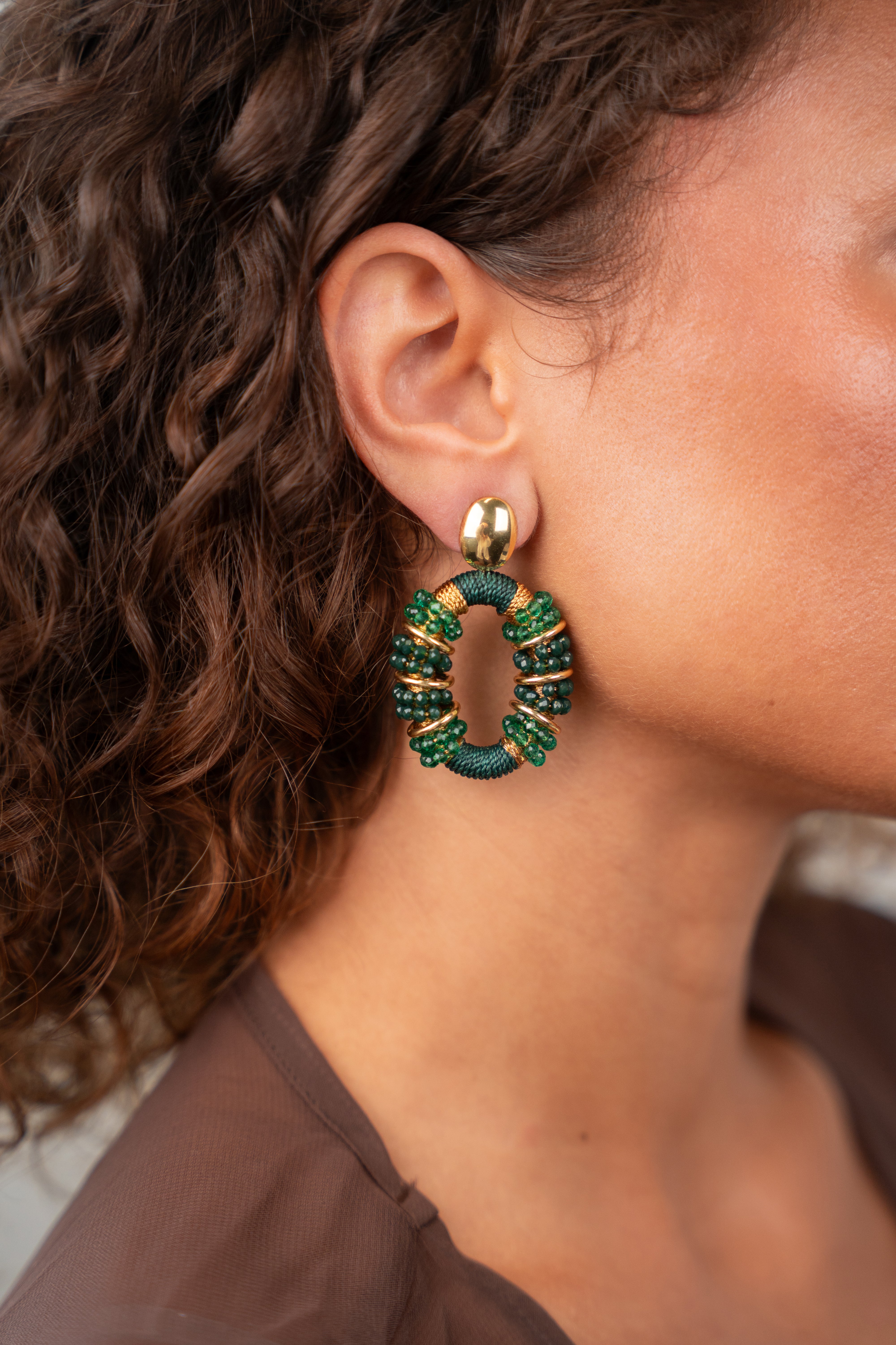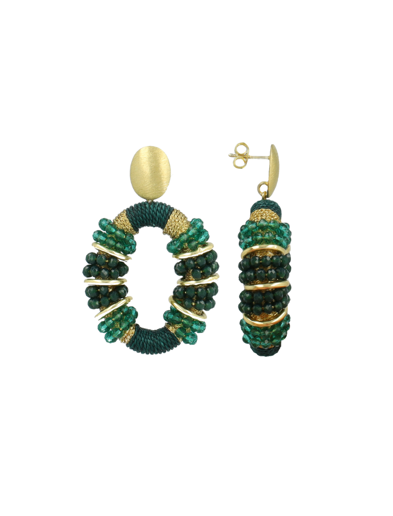 Maak een statement met deze prachtige Elle oorbellen van Lott Gioielli. Deze oorbellen zijn voorzien van een ovaal element met goud en groen zijdedraad, afgewerkt met smaragd groene glassberry kralen en gouden details. Deze oorbellen zijn absoluut blikvangers en perfect voor wie op zoek is naar een opvallend accessoire. Voeg wat flair toe aan je outfit met deze unieke en stijlvolle oorbellen. Handgemaakt met vakmanschap, zijn deze oorbellen een must-have voor elke sieradenliefhebber.