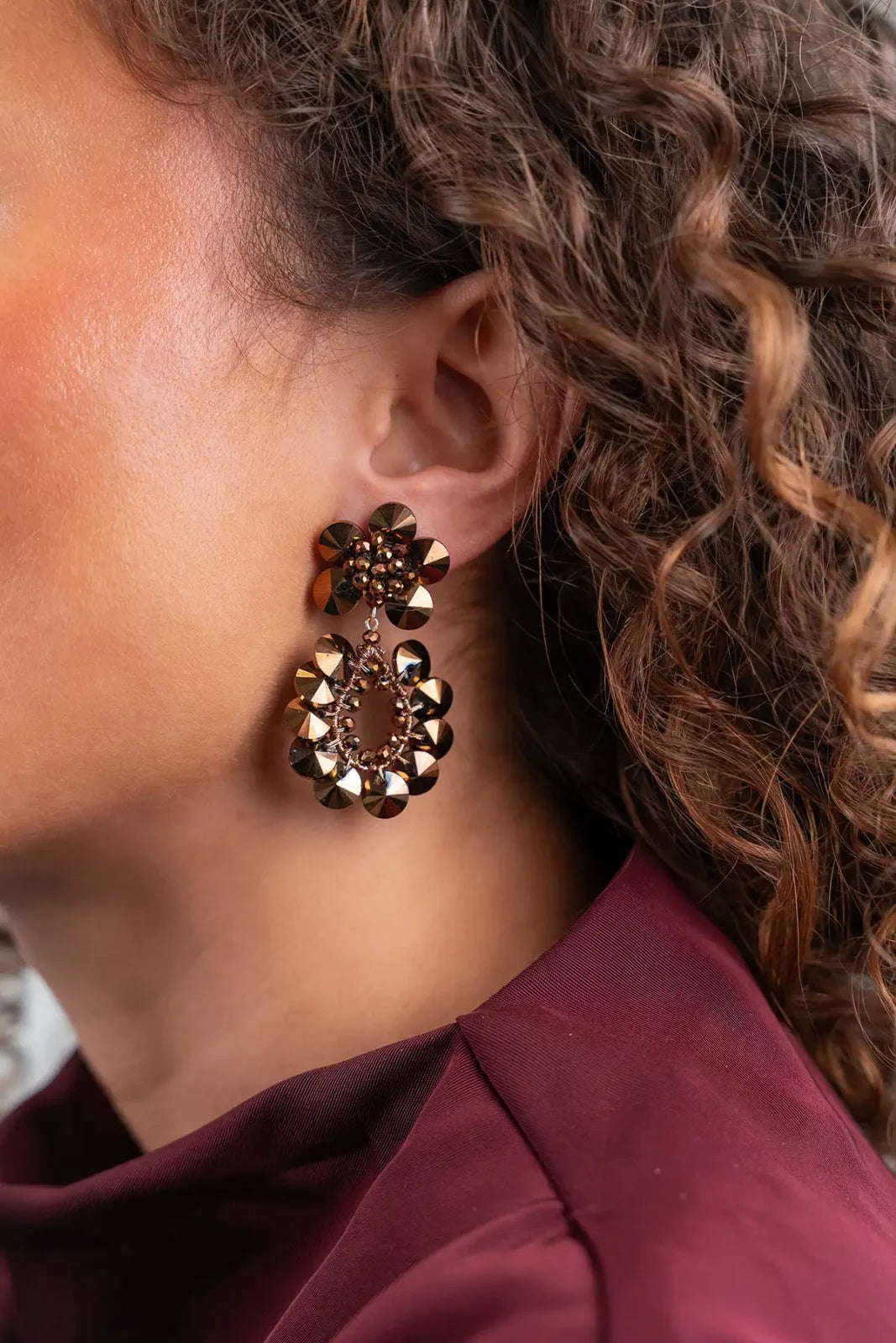 Deze Lott oorbellen zijn prachtige statement oorbellen die zeker de aandacht zullen trekken. Deze oorbellen zijn voorzien van twee elementen onder elkaar, gemaakt met metallic koper kleurige glassberry kralen. Het element dat op het oor rust heeft de vorm van een bloem, wat deze oorbellen echt tot eyecatchers maakt. Bovendien zijn deze oorbellen lichtgewicht en dus comfortabel om de hele dag te dragen. De bruine kleur geeft deze oorbellen een elegante uitstraling en zal elke outfit complementeren.