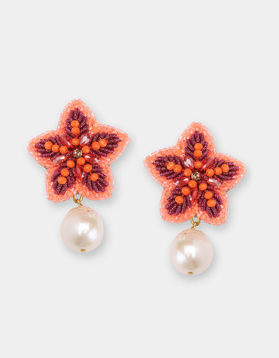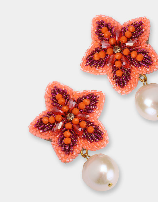 Maak een statement met deze prachtige Olivia Dar oorbellen! De handgeborduurde sterren zijn gedetailleerd en voorzien van kralen en versiersels in een opvallende oranje en roze kleur. Onder elke ster hangt een zoetwaterparel voor een elegante touch. Deze unieke oorbellen zijn perfect voor wie op zoek is naar opvallende oorbellen die je outfit compleet maken.